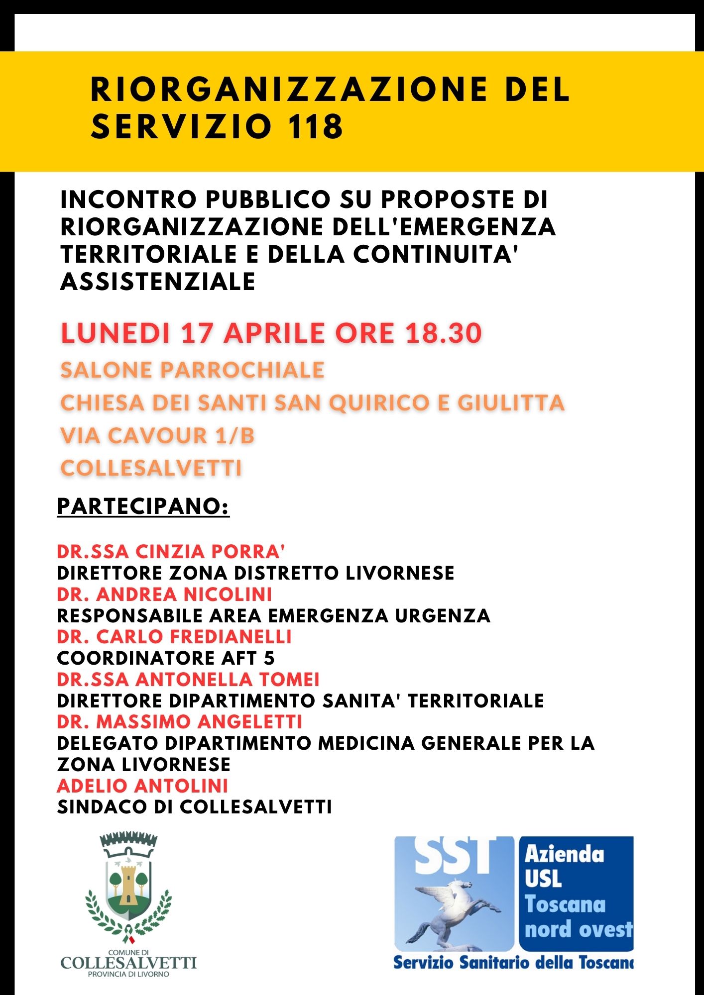 Lunedì 17 aprile alle ore 18.30 presso il Salone Parrocchiale della Chiesa San Quirico e Giulitta (Via Cavour 1/B) si svolgerà un incontro pubblico per discutere sulla riorganizzazione del servizio 118