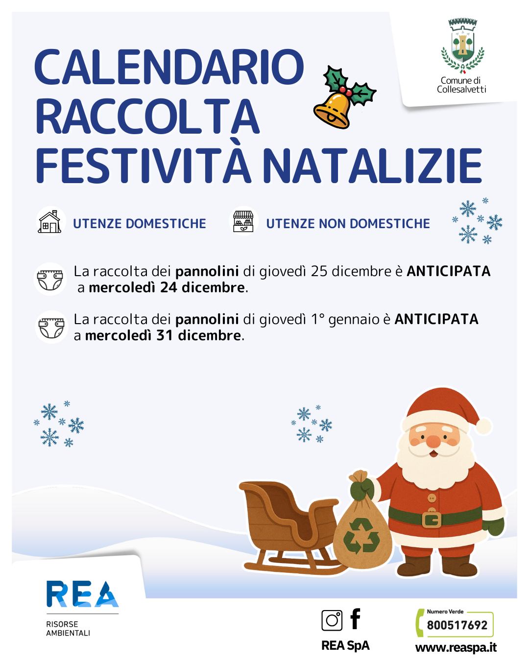 REA SpA informa tutte le utenze che, in occasione delle festività natalizie, il servizio di raccolta dei rifiuti porta a porta subirà una variazione nei giorni del 25 dicembre (Natale) e 1° gennaio (Capodanno).