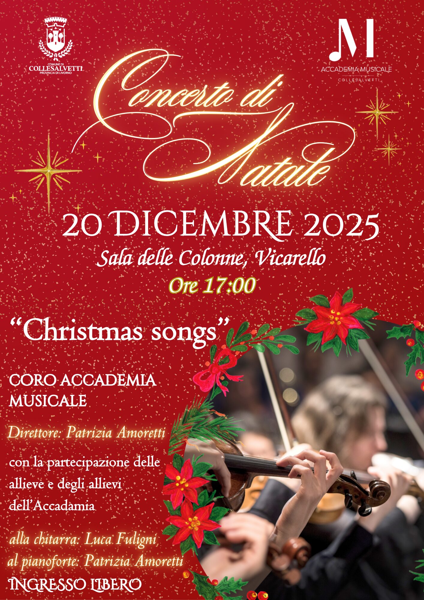 L'Accademia Musicale Collesalvetti, frutto della coprogettazione tra il Comune di Collesalvetti e l' Accademia Musicale Chorus di Livorno, è lieta di invitare la cittadinanza al tradizionale Concerto di Natale, intitolato "Christmas Songs".