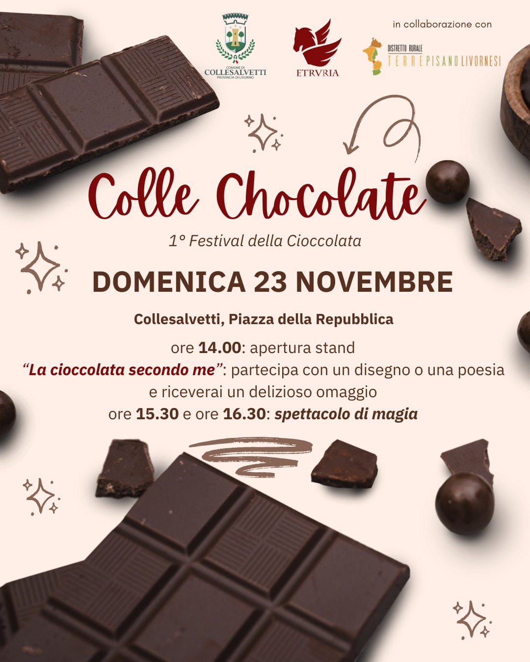 Il Comune di Collesalvetti è lieto di annunciare la prima edizione del "Festival della Cioccolata", una giornata interamente dedicata al cibo degli dei che si terrà domenica 23 novembre 2025 in Piazza della Repubblica.