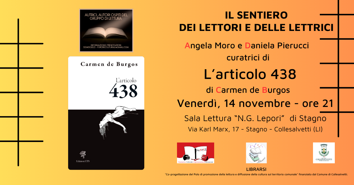 Le docenti Angela Moro e Daniela Pierucci dialogheranno attorno al romanzo breve "L'articolo 438" di Carmen de Burgos, del quale hanno curato la traduzione e l'edizione ETS uscita nel 2024.