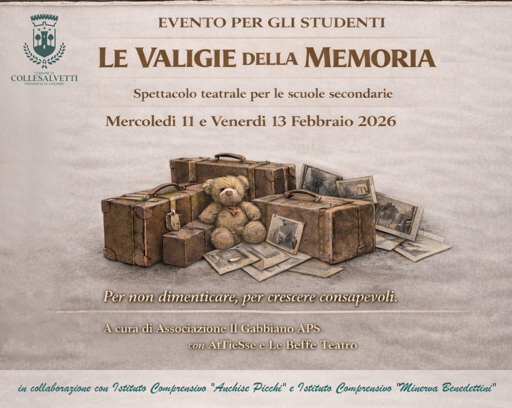 Nelle giornate di mercoledì 11 e venerdì 13 febbraio, le classi terze delle scuole secondarie di primo grado del territorio parteciperanno alla messa in scena de 'Le valigie della memoria, ovvero: dell’umanità perduta'. Lo spettacolo è una produzione dell’Associazione Culturale Il Gabbiano APS, realizzata in collaborazione con AtTieSse e Le Beffe Teatro e indaga le sofferenze provocate dal potere e dalla negazione dei diritti con storie di ieri e di oggi che si incontrano in una scena fatta di valigie e ricordi. Un viaggio emotivo che dal dovere della memoria ci porta a una domanda urgente: oggi, di fronte a tanti bambini che ancora soffrono, cosa abbiamo imparato davvero?
