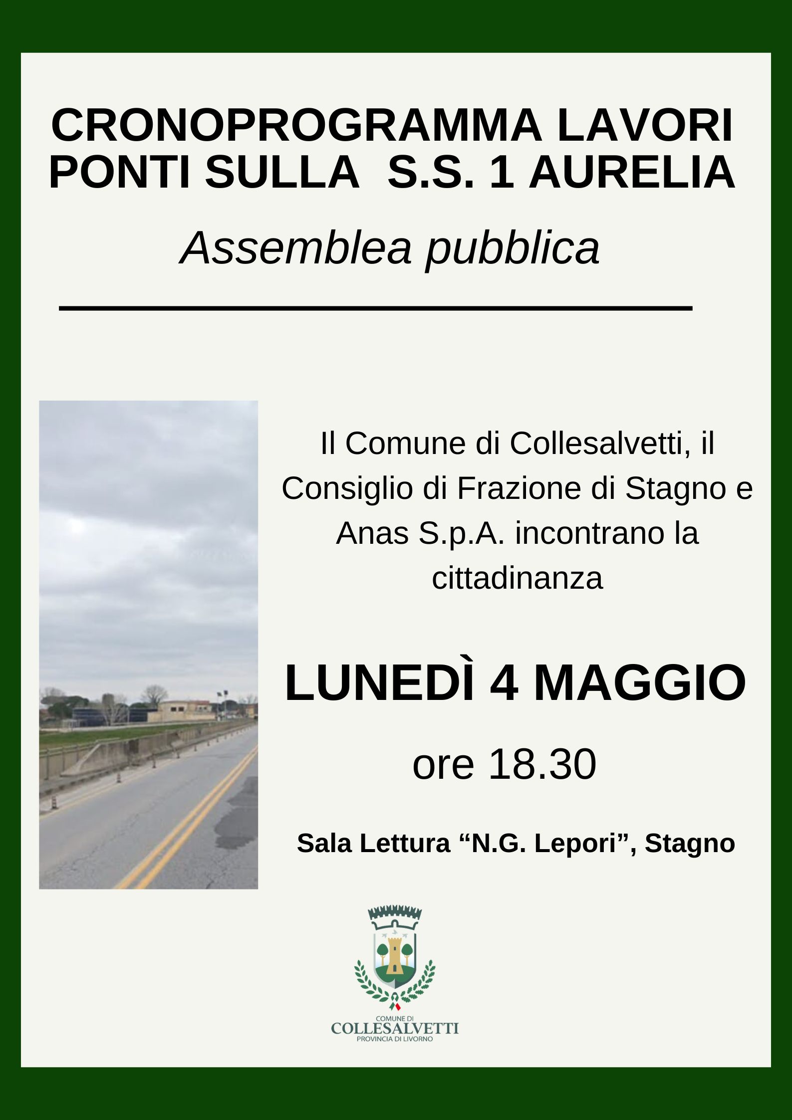 Il Comune di Collesalvetti, il Consiglio di Frazione di Stagno e Anas S.p.A. incontrano la cittadinanza per illustrare il cronoprogramma dei lavori relativi ai ponti sulla S.S. 1 Aurelia.