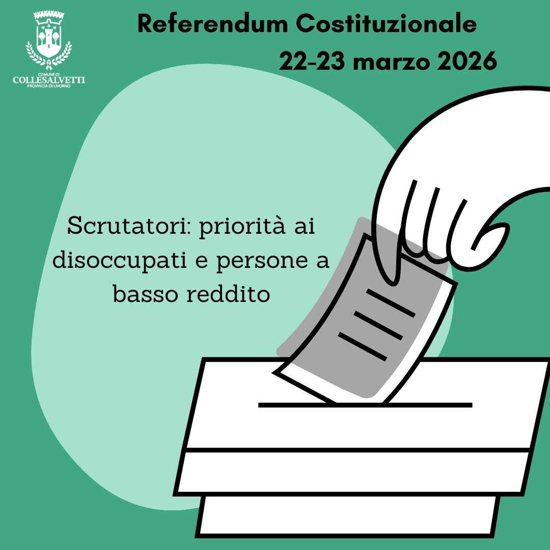 In occasione del prossimo Referendum Costituzionale indetto per il 22 e 23 marzo 2026, nella nomina degli scrutatori di seggio, sarà data priorità ai cittadini (già iscritti nell’albo degli scrutatori) disoccupati o che si trovino in condizioni di basso reddito.