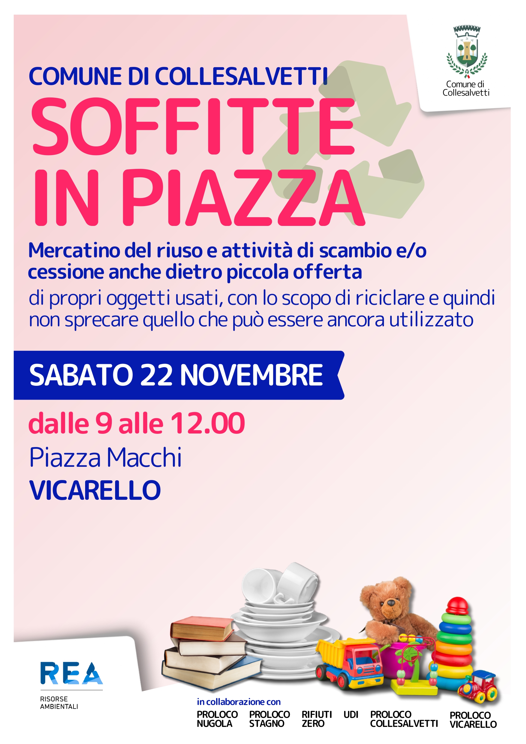 “Soffitte in Piazza” è aperto a tutti i privati cittadini residenti nel Comune di Collesalvetti che vogliono cedere (anche su libera offerta) e barattare oggetti che non utilizzano più, quali: libri, riviste, giornali, cartoline, francobolli, figurine, mobili, sedie, biciclette, oggettistica varia, vecchi arnesi ed attrezzi, piccoli elettrodomestici usati, abbigliamento e tessuti usati, giochi, modellismo.