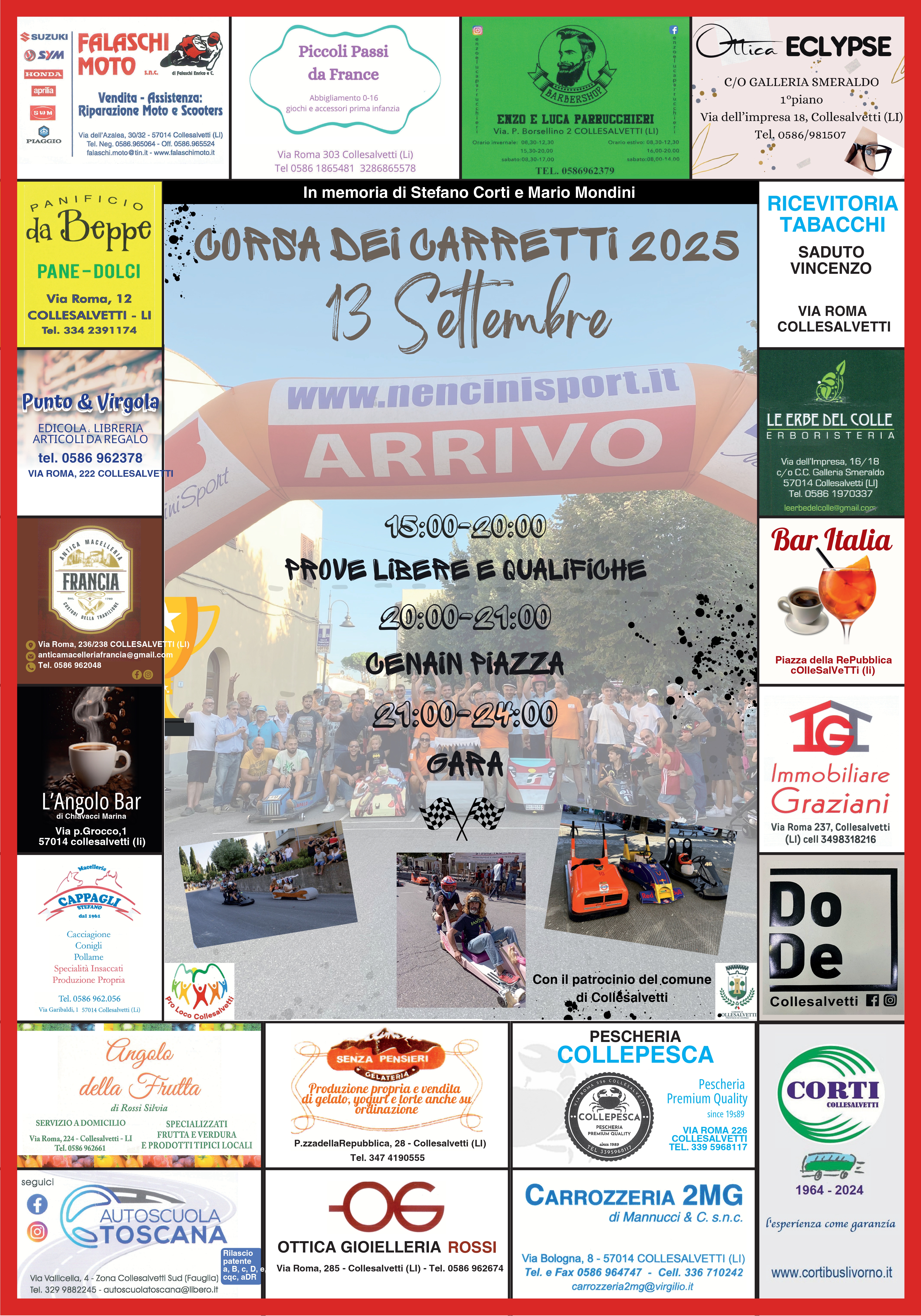 La Pro Loco di Collesalvetti APS, con il patrocinio del Comune di Collesalvetti, organizza per sabato 13 settembre 2025 la tradizionale "Corsa dei carretti". Dalle ore 15:00 alle ore 20:00 si svolgeranno le prove libere e qualifiche, dalle ore 20.00 alle ore 21.00 "Cena in piazza" e alle ore 21.00 avrà inizio la gara.